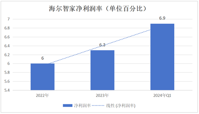 一直以来,三巨头中,海尔智家费率和净利率都是投资者关注的焦点。第一季度利润增速超过20%,那么他的净利率表现如何?为此,笔者专门查阅了2022年、2023年以及2024年第一季度的净利润率情况,具体数据如下: