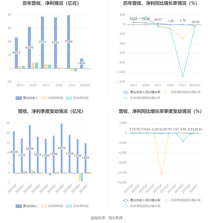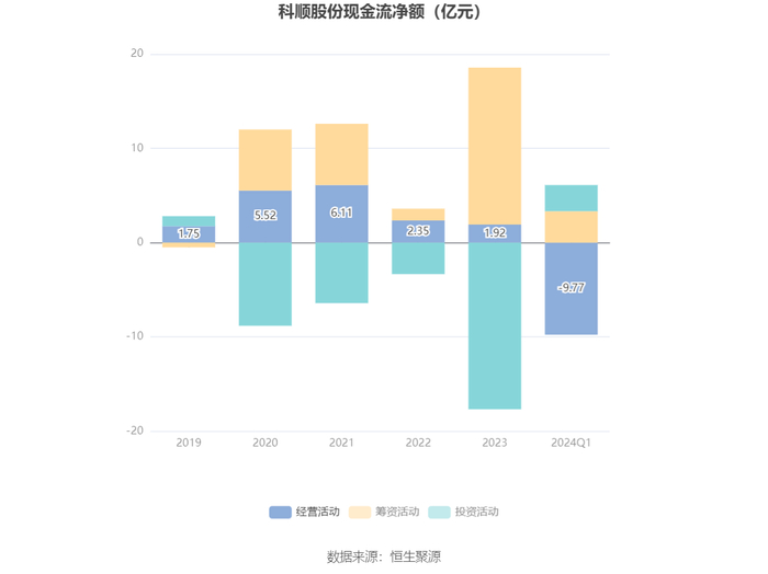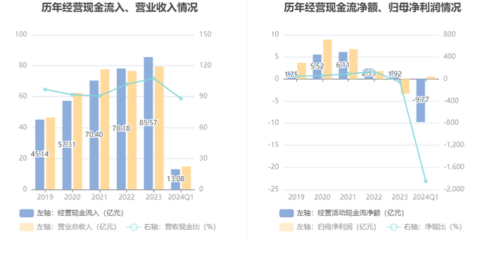 2024年第一季度,公司经营活动现金流净额为-9.77亿元,同比减少3.20亿元,主要系收到的货款减少以及支付所致;筹资活动现金流净额3.33亿元,同比增加6038.77万元;投资活动现金流净额2.78亿元,上年同期为-1.17亿元。