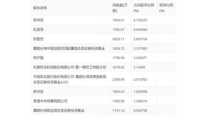 一季报显示,2024年一季度末公司十大流通股东中,新进股东为科顺防水科技股份有限公司-第一期员工持股计划、香港中央结算有限公司,取代了上年末的中国人寿资管-广发银行-国寿资产-科顺优势甄选2156保险资产管理产品、华鑫证券-上海银行-华鑫证券旭康2号集合资产管理计划。在具体持股比例上,陈伟忠、阮宜宝、陈智忠、景顺长城中国回报灵活配置混合型证券投资基金、陈作留、中国农业银行股份有限公司-景顺长城资源垄断混合型证券投资基金(LOF)、陈华忠、景顺长城致远混合型证券投资基金持股有所下降。