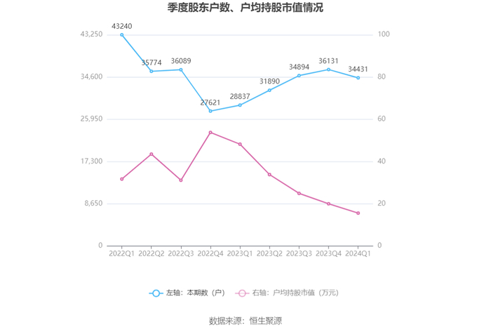 筹码集中度方面,截至2024年一季度末,公司股东总户数为3.44万户,较上年末下降了1700户,降幅4.71%;户均持股市值由上年末的20.01万元下降至15.59万元,降幅为22.09%。