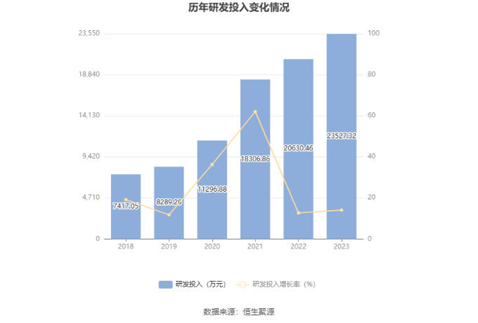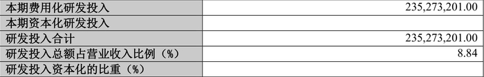 2023年全年,公司研发投入金额为2.35亿元,同比增长14.04%;研发投入占营业收入比例为8.84%,相比上年同期上升0.34个百分点。此外,公司全年研发投入资本化率为0。