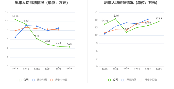 截至2023年末,公司员工总数为5907人,人均创收45.04万元,人均创利4.35万元,人均薪酬17.38万元,较上年同期分别变化6.10%、-2.11%、9.91%。