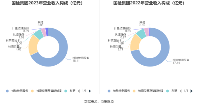 分产品来看,2023年公司主营业务中,检验检测服务收入18.11亿元,同比增长3.80%,占营业收入的68.06%;检测仪器及智能制造收入4.83亿元,同比增长30.18%,占营业收入的18.16%;科研及技术服务收入2.00亿元,同比增长6.59%,占营业收入的7.54%。