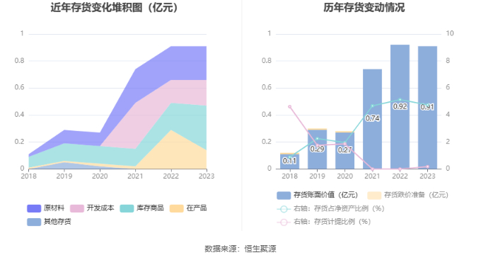 从存货变动来看,截至2023年年末,公司存货账面价值为9081.82万元,占净资产的4.75%。其中,存货跌价准备为15.99万元,计提比例为0.18%。