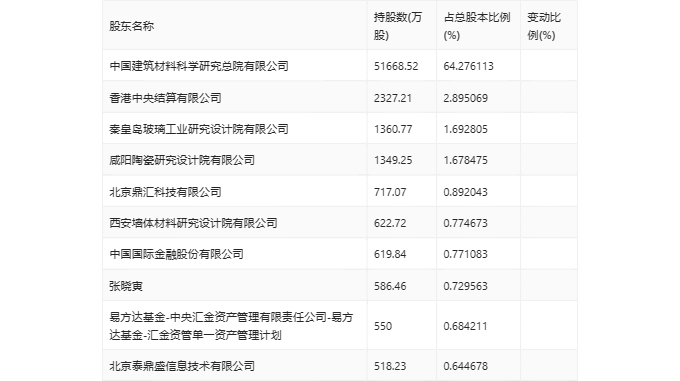 年报显示,2023年年末公司十大流通股东中,新进股东为中国国际金融股份有限公司,取代了三季度末的玖歌玖富五号私募证券投资基金。在具体持股比例上,香港中央结算有限公司、易方达基金-中央汇金资产管理有限责任公司-易方达基金-汇金资管单一资产管理计划持股有所上升,中国建筑材料科学研究总院有限公司、秦皇岛玻璃工业研究设计院有限公司、咸阳陶瓷研究设计院有限公司、北京鼎汇科技有限公司、西安墙体材料研究设计院有限公司、张晓寅、北京泰鼎盛信息技术有限公司持股有所下降。