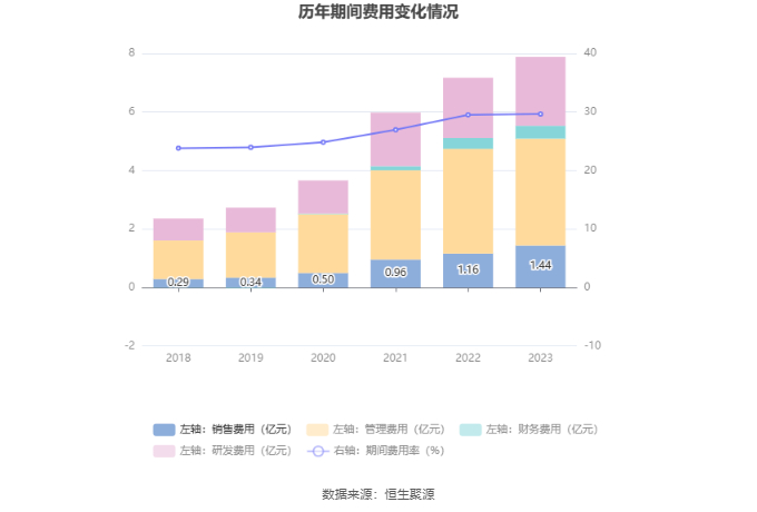 2023年,公司期间费用为7.88亿元,较上年同期增加7175.53万元;期间费用率为29.64%,较上年同期上升0.12个百分点。其中,销售费用同比增长24.66%,管理费用同比增长1.86%,研发费用同比增长14.04%,财务费用同比增长20.75%。