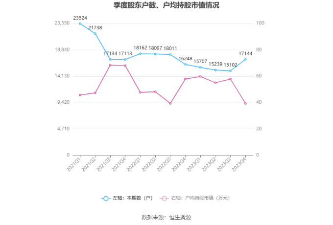 筹码集中度方面,截至2023年年末,公司股东总户数为1.71万户,较三季度末增长了2042户,增幅13.52%;户均持股市值由三季度末的57.82万元下降至39.39万元,降幅为31.87%。