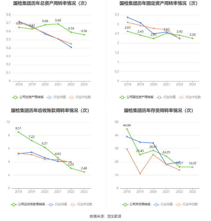 营运能力方面,2023年,公司公司总资产周转率为0.56次,上年同期为0.59次(2022年行业平均值为0.41次,公司位居同行业3/19);固定资产周转率为2.26次,上年同期为2.42次(2022年行业平均值为2.26次,公司位居同行业9/19);公司应收账款周转率、存货周转率分别为2.48次、16.05次。