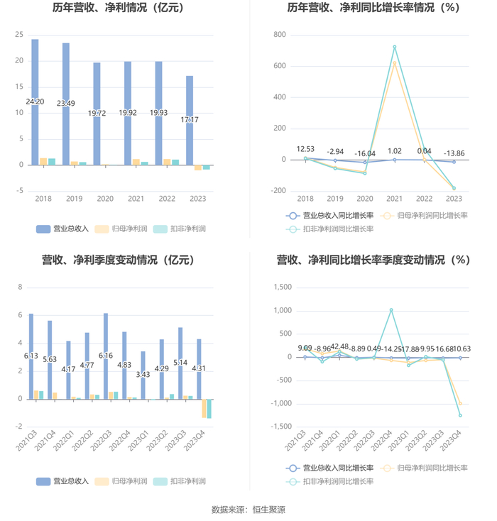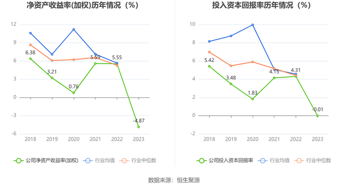 数据显示,2023年公司加权平均净资产收益率为-4.87%,较上年同期下降10.42个百分点;公司2023年投入资本回报率为-0.01%,较上年同期下降4.32个百分点。