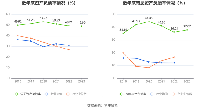 在偿债能力方面,公司2023年年末资产负债率为48.96%,相比上年末下降0.25个百分点;有息资产负债率为37.87%,相比上年末上升1.84个百分点。