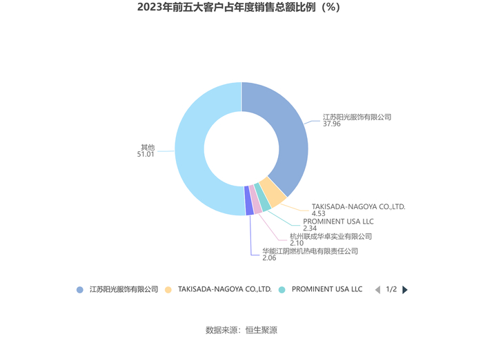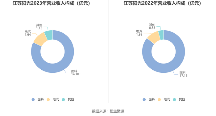 分产品来看,2023年公司主营业务中,面料收入14.10亿元,同比下降17.61%,占营业收入的82.09%;电汽收入1.94亿元,同比下降2.71%,占营业收入的11.30%。