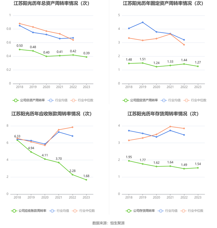营运能力方面,2023年,公司公司总资产周转率为0.39次,上年同期为0.42次(2022年行业平均值为0.67次,公司位居同行业14/19);固定资产周转率为1.27次,上年同期为1.44次(2022年行业平均值为3.21次,公司位居同行业14/19);公司应收账款周转率、存货周转率分别为1.68次、1.54次。