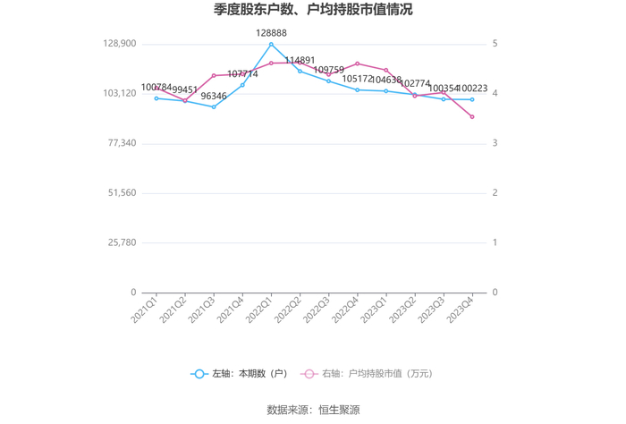 筹码集中度方面,截至2023年年末,公司股东总户数为10.02万户,较三季度末下降了131户,降幅0.13%;户均持股市值由三季度末的4.03万元下降至3.54万元,降幅为12.16%。