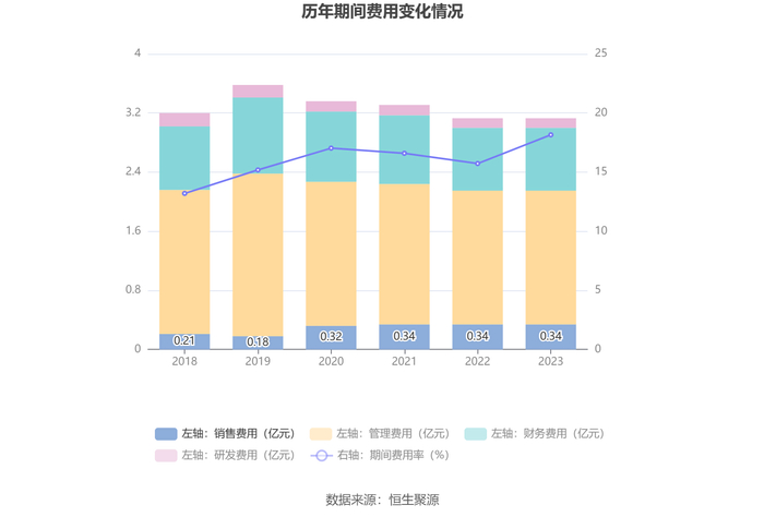 2023年,公司期间费用为3.12亿元,同比减少168.84万元;但期间费用率为18.16%,同比增长2.43个百分点。其中,销售费用同比下降2.62%,管理费用同比下降0.34%,研发费用同比增长1.66%,财务费用同比下降0.45%。