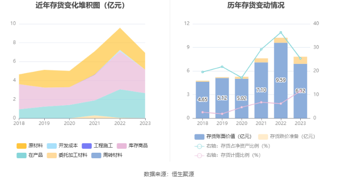 从存货变动来看,截至2023年年末,公司存货账面价值为6.92亿元,占净资产的25.37%,较上年末减少2.66亿元。其中,存货跌价准备为9006.38万元,计提比例为11.51%。