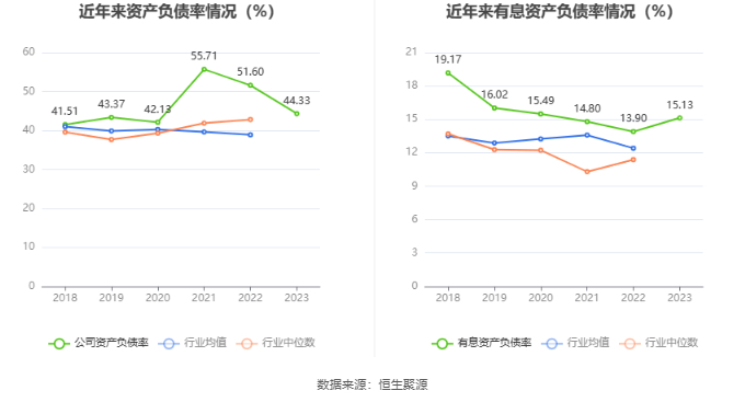 在偿债能力方面,公司2023年年末资产负债率为44.33%,相比上年末下降7.27个百分点;有息资产负债率为15.13%,相比上年末上升1.23个百分点。
