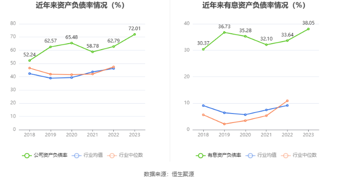 在偿债能力方面,公司2023年年末资产负债率为72.01%,相比上年末上升9.22个百分点;有息资产负债率为38.05%,相比上年末上升4.41个百分点。
