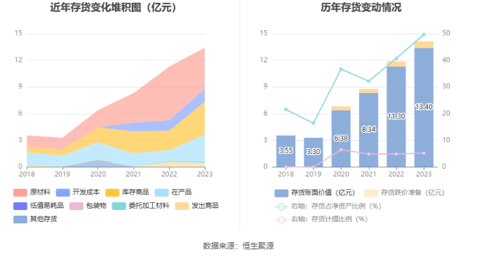 从存货变动来看,截至2023年年末,公司存货账面价值为13.4亿元,占净资产的49.66%,较上年末增加2.1亿元。其中,存货跌价准备为7427.67万元,计提比例为5.25%。