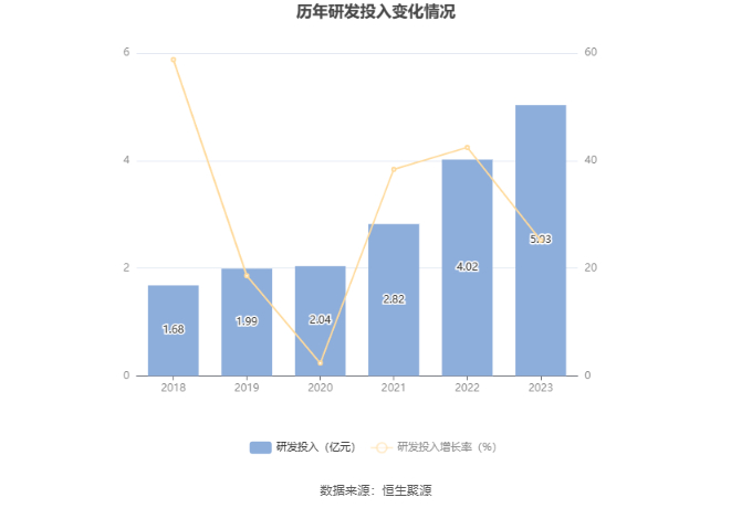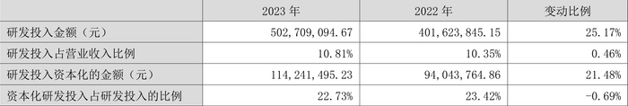 2023年全年,公司研发投入金额为5.03亿元,同比增长25.17%;研发投入占营业收入比例为10.81%,相比上年同期上升0.46个百分点。此外,公司全年研发投入资本化率为22.73%。