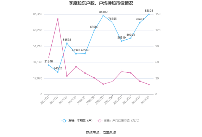 筹码集中度方面,截至2023年年末,公司股东总户数为8.53万户,较三季度末增长了8851户,增幅11.57%;户均持股市值由三季度末的25.08万元下降至18.94万元,降幅为24.48%。