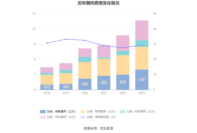 2023年,公司期间费用为13.70亿元,较上年同期增加2.93亿元;期间费用率为29.44%,较上年同期上升1.70个百分点。其中,销售费用同比增长33.17%,管理费用同比增长16.13%,研发费用同比增长26.3%,财务费用同比增长60.33%。