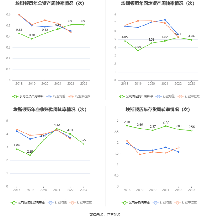 营运能力方面,2023年,公司公司总资产周转率为0.51次,上年同期为0.51次(2022年行业平均值为0.45次,公司位居同行业8/22);固定资产周转率为4.94次,上年同期为5.21次(2022年行业平均值为5.61次,公司位居同行业12/22);公司应收账款周转率、存货周转率分别为3.27次、2.56次。