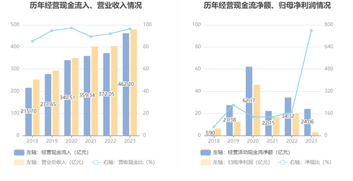 2023年,公司营业收入现金比为96.41%,净现比为759.74%。