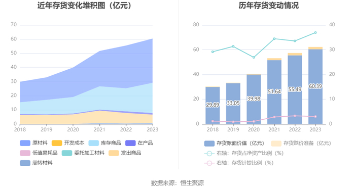 从存货变动来看,截至2023年年末,公司存货账面价值为60.39亿元,占净资产的36.94%,较上年末增加4.9亿元。其中,存货跌价准备为1.91亿元,计提比例为3.06%。