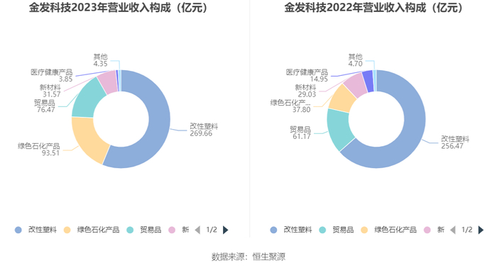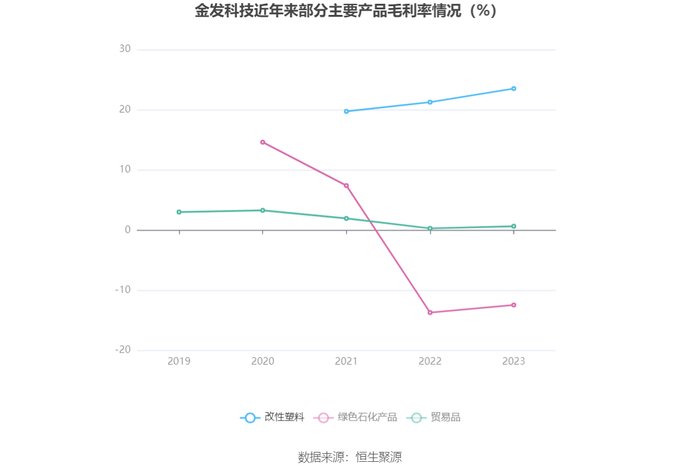 分产品看,改性塑料、绿色石化产品、贸易品2023年毛利率分别为23.51%、-12.44%、0.64%。