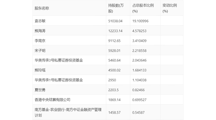 年报显示,2023年年末公司十大流通股东中,持股最多的为袁志敏,占比19.10%。十大流通股东名单相比2023年三季报维持不变。在具体持股比例上,李南京、夏世勇持股有所上升,香港中央结算有限公司持股有所下降。