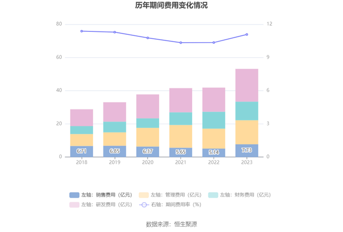 2023年,公司期间费用为53.14亿元,较上年同期增加11.29亿元;期间费用率为11.08%,较上年同期上升0.73个百分点。其中,销售费用同比增长50.33%,管理费用同比增长20.7%,研发费用同比增长35.72%,财务费用同比增长10.12%。