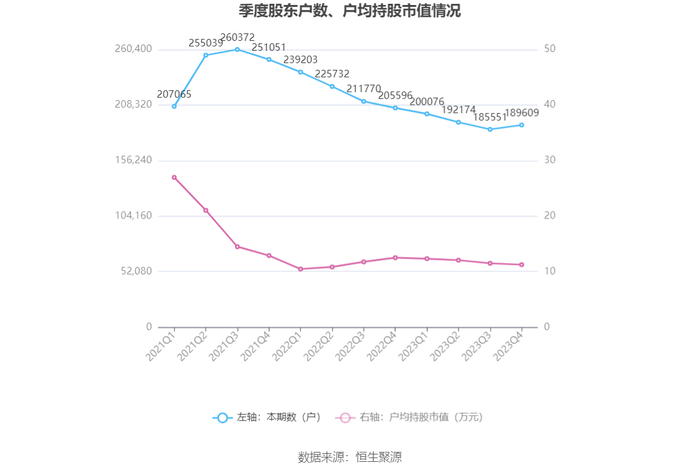 筹码集中度方面,截至2023年年末,公司股东总户数为18.96万户,较三季度末增长了4058户,增幅2.19%;户均持股市值由三季度末的11.51万元下降至11.26万元,降幅为2.17%。