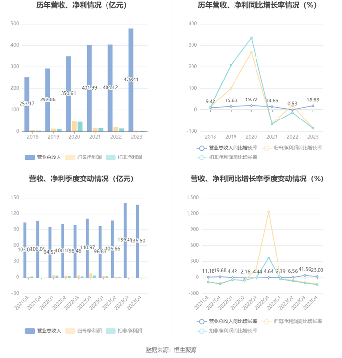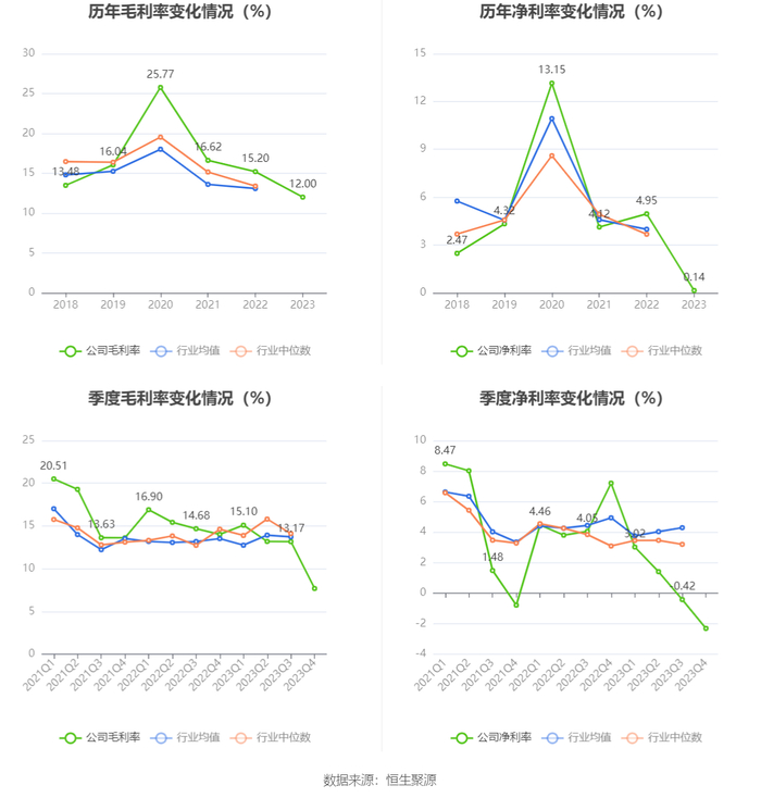 2023年,公司毛利率为12.00%,同比下降3.20个百分点;净利率为0.14%,较上年同期下降4.81个百分点。从单季度指标来看,2023年第四季度公司毛利率为7.69%,同比下降6.33个百分点,环比下降5.48个百分点;净利率为-2.31%,较上年同期下降9.52个百分点,较上一季度下降1.89个百分点。