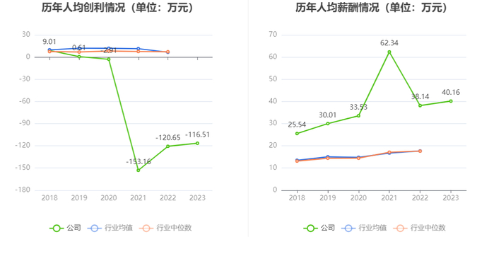 截至2023年末,公司员工总数为665人,人均创收211.82万元,人均创利-116.51万元,人均薪酬40.16万元,较上年同期分别变化-5.75%、3.43%、5.29%。