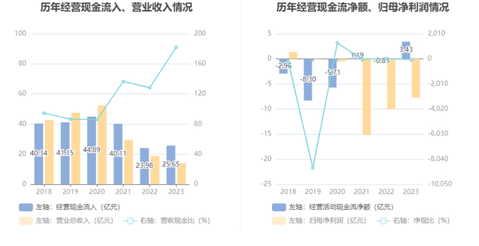 2023年,公司营业收入现金比为182.07%,净现比为-44.27%。