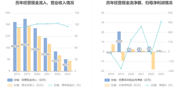 2023年,公司经营活动现金流净额为8246.67万元,同比下降84.23%;筹资活动现金流净额-6.77亿元,同比增加7.88亿元;投资活动现金流净额5.80亿元,上年同期为5.93亿元。