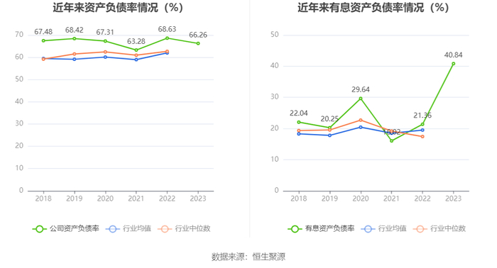 在偿债能力方面,公司2023年年末资产负债率为66.26%,相比上年末下降2.37个百分点;有息资产负债率为40.84%,相比上年末上升19.48个百分点。