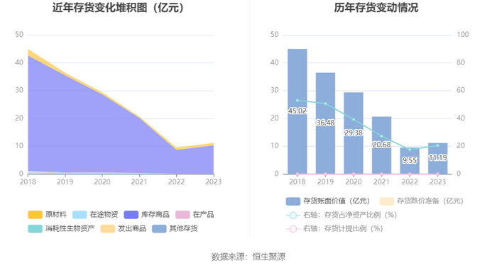 从存货变动来看,截至2023年年末,公司存货账面价值为11.19亿元,占净资产的20.54%。其中,存货跌价准备为70.81万元,计提比例为0.06%。