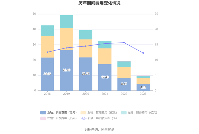 2023年,公司期间费用为9.88亿元,同比减少9.44亿元;期间费用率为12.29%,同比下降3.4个百分点。其中,销售费用同比下降49.01%,管理费用同比下降41.67%,研发费用同比下降35.55%,财务费用同比下降63.37%。