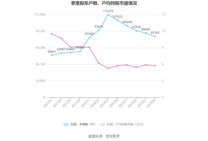 筹码集中度方面,截至2023年年末,公司股东总户数为8.52万户,较三季度末下降了4694户,降幅5.22%;户均持股市值由三季度末的5.91万元下降至5.78万元,降幅为2.20%。