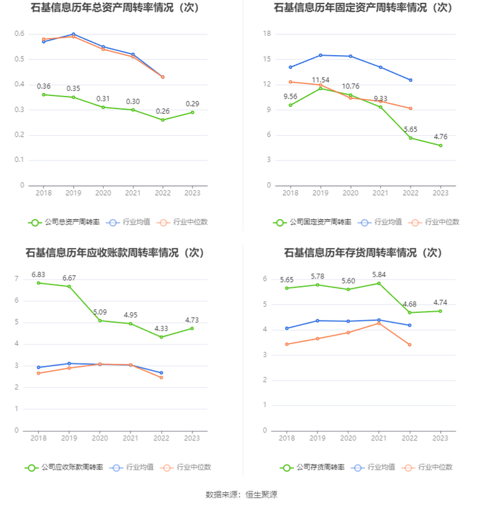 营运能力方面,2023年,公司公司总资产周转率为0.29次,上年同期为0.26次(2022年行业平均值为0.43次,公司位居同行业84/103);固定资产周转率为4.76次,上年同期为5.65次(2022年行业平均值为12.54次,公司位居同行业71/103);公司应收账款周转率、存货周转率分别为4.73次、4.74次。