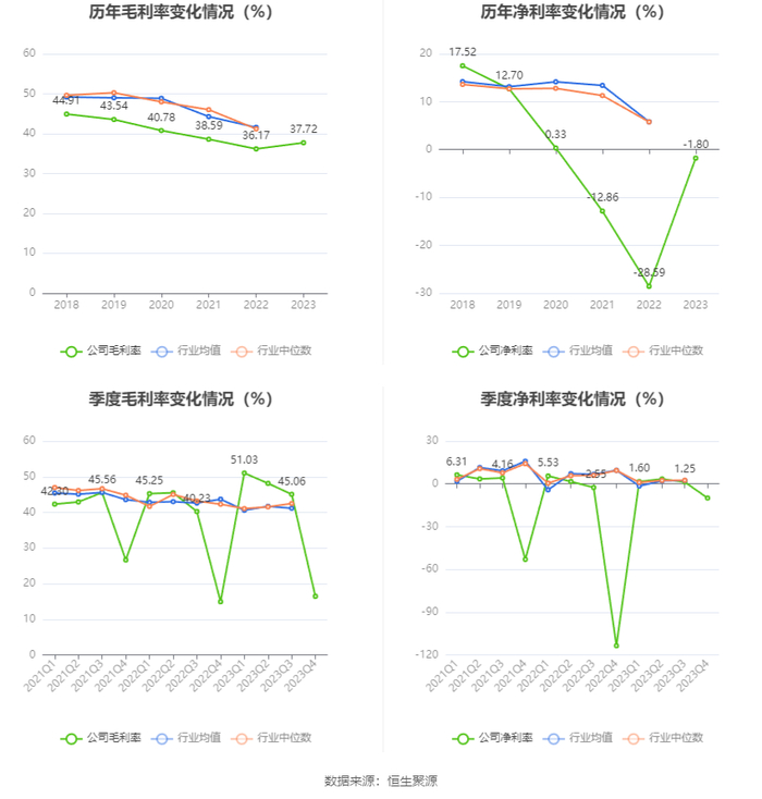 2023年,公司毛利率为37.72%,同比上升1.55个百分点;净利率为-1.80%,较上年同期上升26.79个百分点。从单季度指标来看,2023年第四季度公司毛利率为16.44%,同比上升1.52个百分点,环比下降28.62个百分点;净利率为-9.94%,较上年同期上升103.62个百分点,较上一季度下降11.19个百分点。