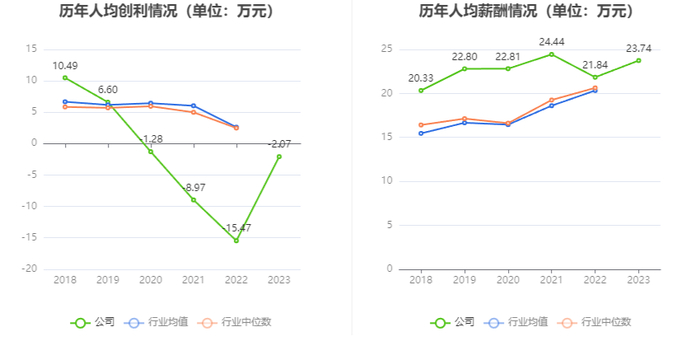 截至2023年末,公司员工总数为5048人,人均创收54.46万元,人均创利-2.07万元,人均薪酬23.74万元,较上年同期分别增长5.70%、86.60%、8.67%。