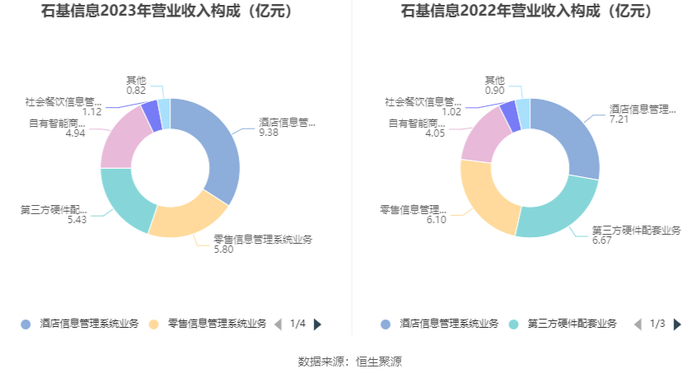 分产品来看,2023年公司主营业务中,酒店信息管理系统业务收入9.38亿元,同比增长30.09%,占营业收入的34.10%;零售信息管理系统业务收入5.80亿元,同比下降5.02%,占营业收入的21.09%;第三方硬件配套业务收入5.43亿元,同比下降18.65%,占营业收入的19.75%。