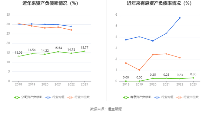 在偿债能力方面,公司2023年年末资产负债率为15.77%,相比上年末上升1.04个百分点;有息资产负债率为0.30%,相比上年末上升0.07个百分点。