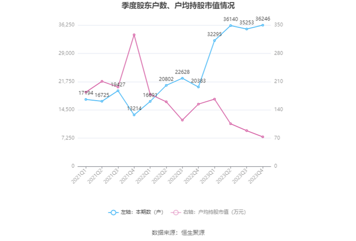 筹码集中度方面,截至2023年年末,公司股东总户数为3.62万户,较三季度末增长了993户,增幅2.82%;户均持股市值由三季度末的88.64万元下降至73.34万元,降幅为17.26%。