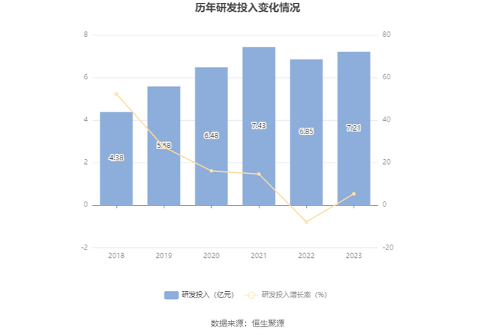 2023年全年,公司研发投入金额为7.21亿元,同比增长5.37%;研发投入占营业收入比例为26.24%,相比上年同期下降0.14个百分点。此外,公司全年研发投入资本化率为58.64%。
