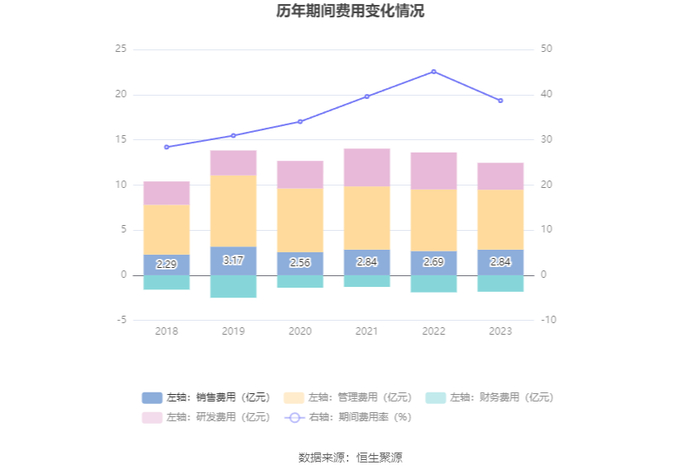 2023年,公司期间费用为10.63亿元,较上年同期减少1.07亿元;期间费用率为38.67%,较上年同期下降6.42个百分点。其中,销售费用同比增长5.46%,管理费用同比下降2.56%,研发费用同比下降27.19%,财务费用由去年同期的-1.89亿元变为-1.82亿元。