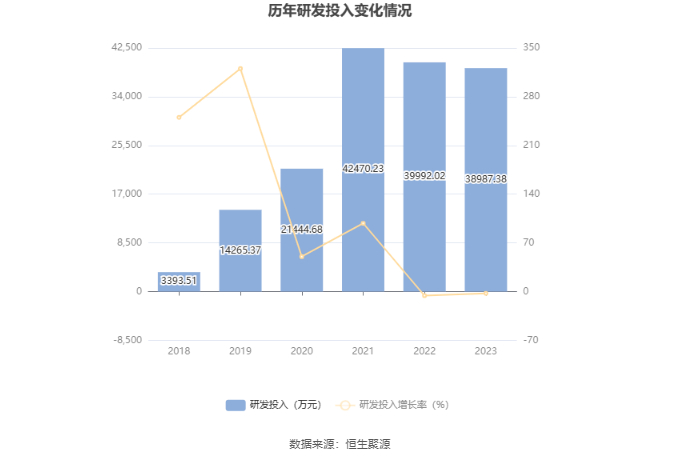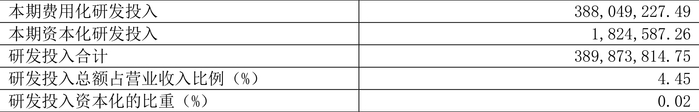 2023年全年,公司研发投入金额为3.90亿元,同比下降2.51%;研发投入占营业收入比例为4.45%,相比上年同期上升0.87个百分点。此外,公司全年研发投入资本化率为0.02%。