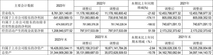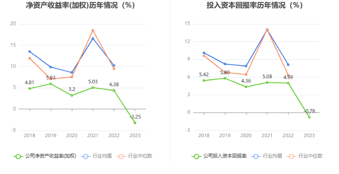 数据显示,2023年公司加权平均净资产收益率为-3.25%,较上年同期下降7.63个百分点;公司2023年投入资本回报率为-0.78%,较上年同期下降5.77个百分点。